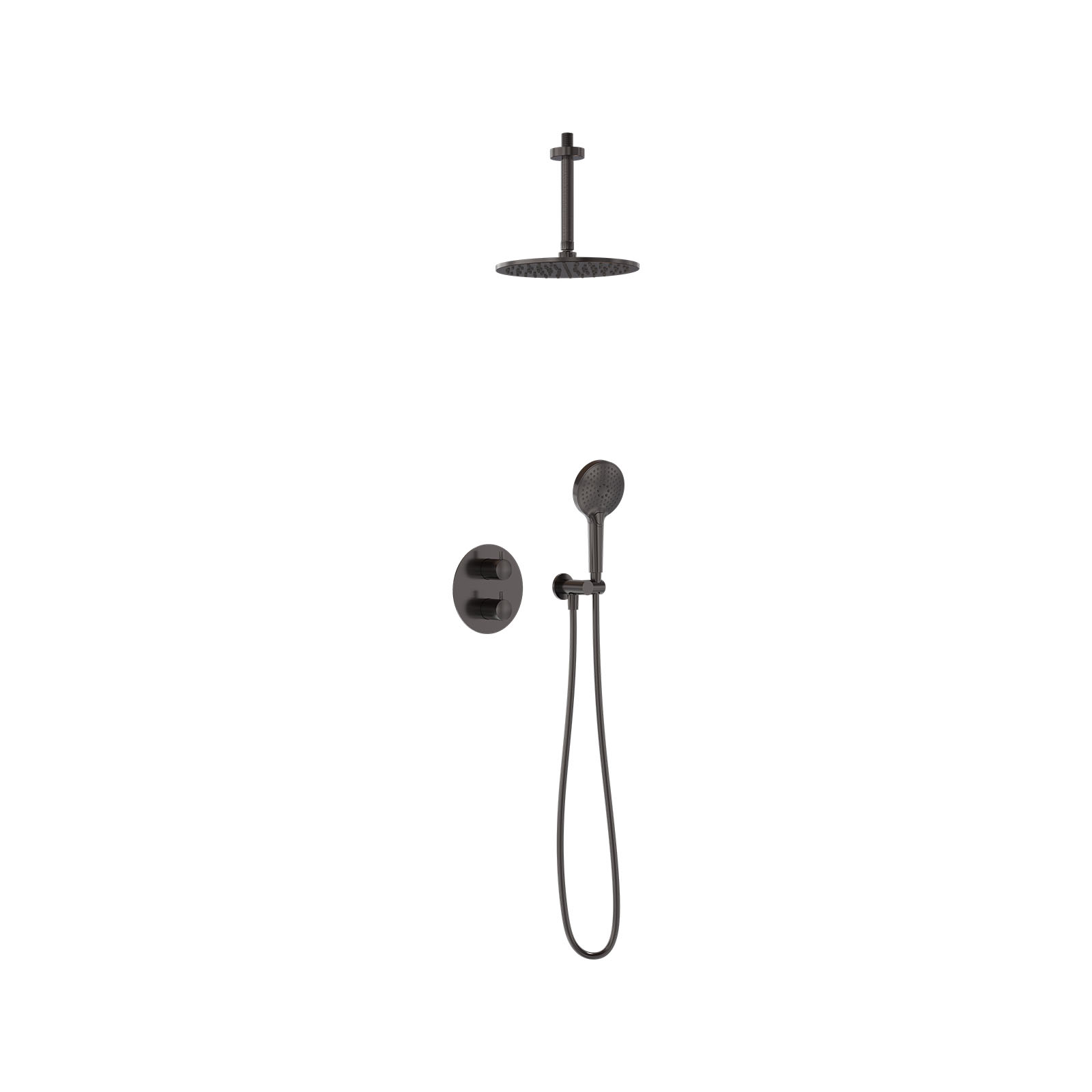 Regendoucheset inbouw met thermostaat en plafondbuis, incl. 3-standen handdouche en hoofddouche Ø25cm – Geborsteld carbon black PVD